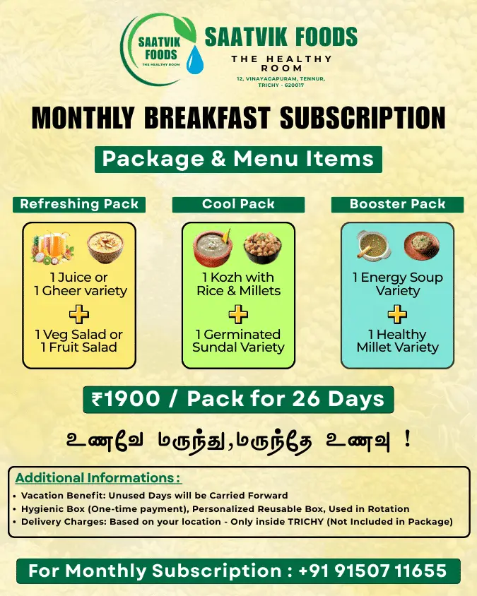 Menu: Every day includes 1 variety of Kozh and 1 Sundal variety (changes daily)